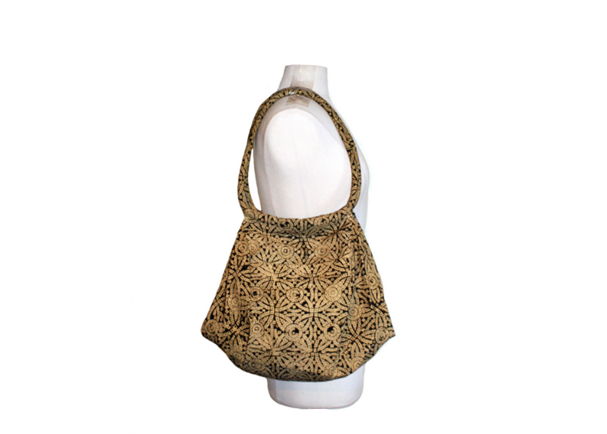 This unique spin on the typical shoulder bag is fashionable as well as versatile. Complete with naturally dyed block-printed cotton fabric, two side pockets and a long zipper opening in the middle, this bag can be tossed over your shoulder on the way to carpool or yoga class.