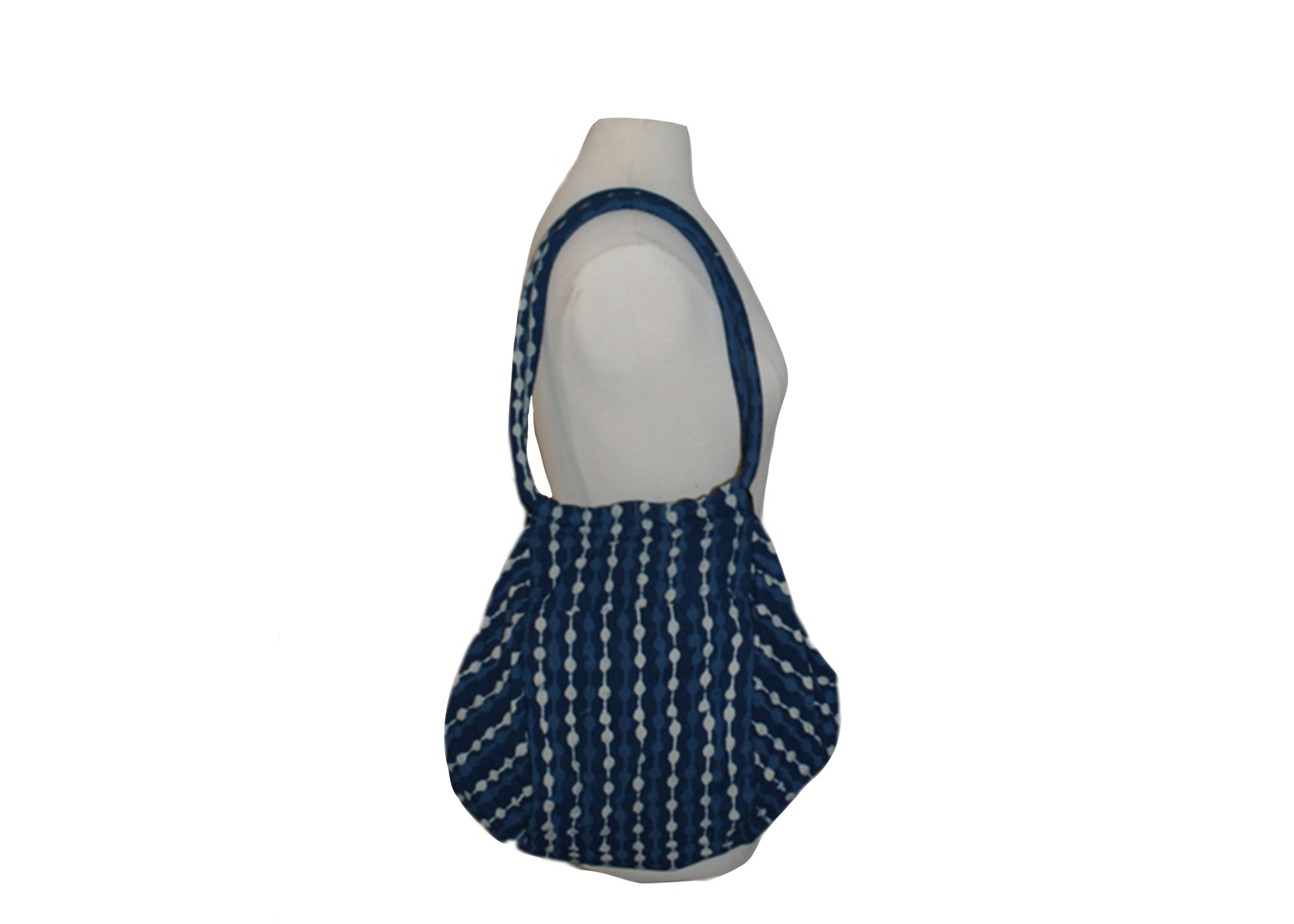 This unique spin on the typical shoulder bag is fashionable as well as versatile. Complete with naturally dyed block-printed cotton fabric, two side pockets and a long zipper opening in the middle, this bag can be tossed over your shoulder on the way to carpool or yoga class.