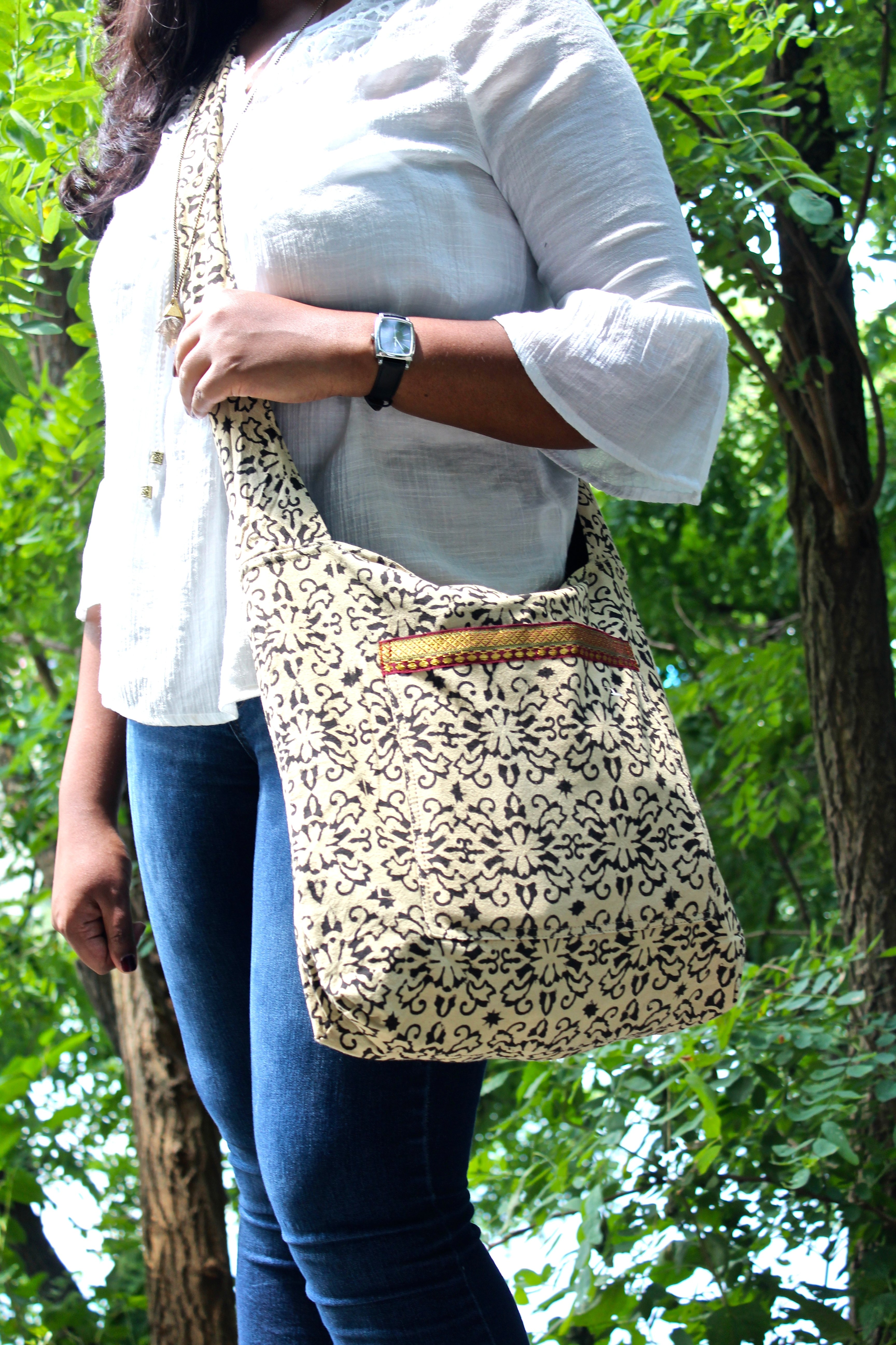This bag delivers style, organization and versatility. Our Cross-body bags are handcrafted using naturally dyed block-printed cotton fabric, making each bag one of a kind. This style has a zip-top closure, an easily adjustable strap, three interior pockets, and one external quick-access slip pocket. The extra large interior is spacious enough for all your daily needs. This is the perfect bag to take with you when running errands or meeting friends.