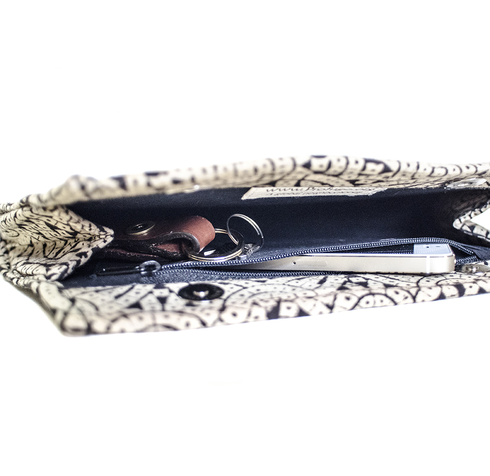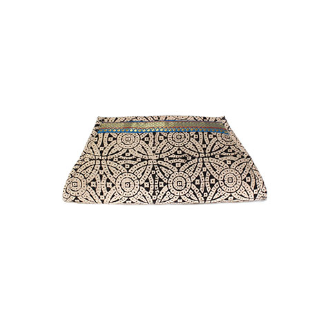Add some extra pizzazz to any outfit with this stylish day to night Clutch tucked under your arm. When all you need are a few staple items this naturally dyed, block printed clutch with metallic accents is just the thing. It offers a convenient snap closure, an inside zipper pocket, and a tailored construction to allow this clutch to keep its elegant shape.